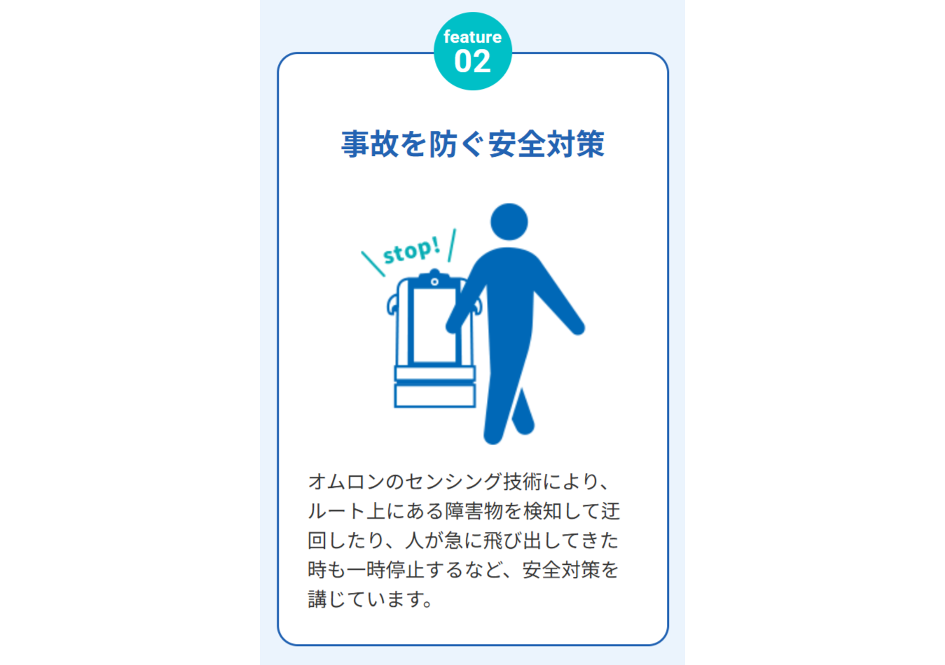 オムロンのセンシング技術により、ルート上にある障害物を検知して迂回したり、人が急に飛び出してきた時も一時停止するなど、安全対策を講じています。