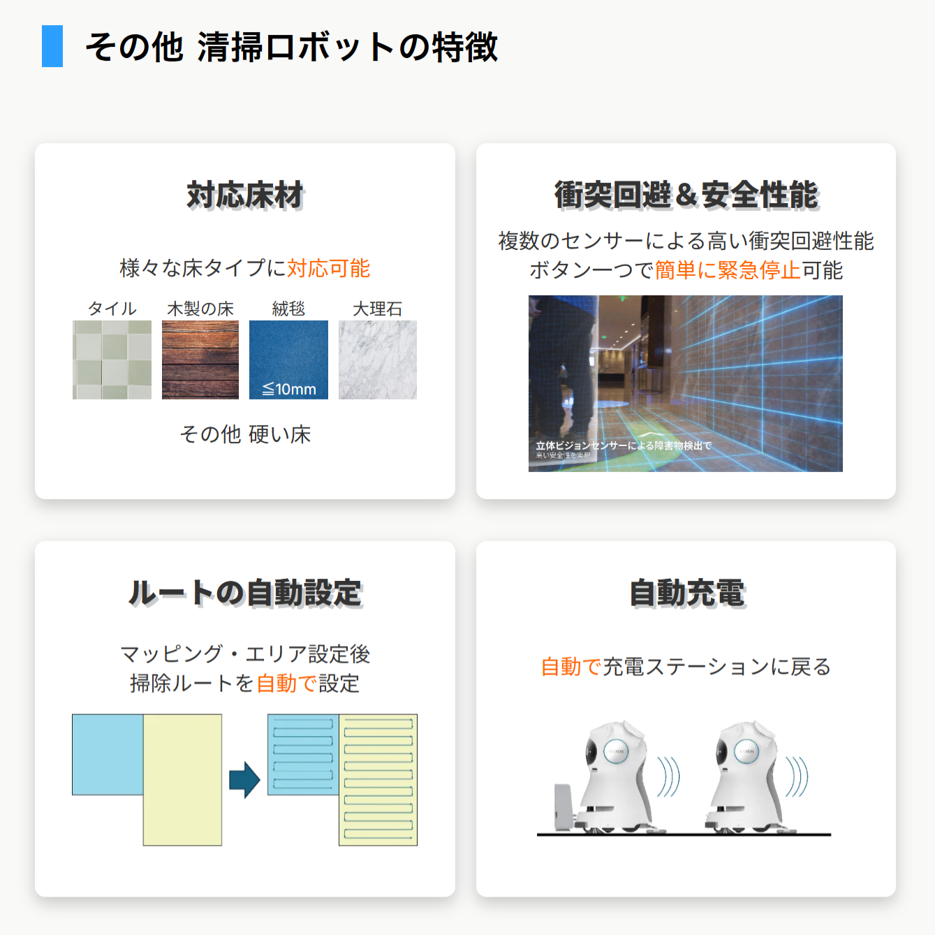 フル充電で最長9時間、広範囲を清掃でき、給排水や充電も自動で実施。飲食店や工場、公共交通機関、教育機関などどんな場所でも活躍します。
